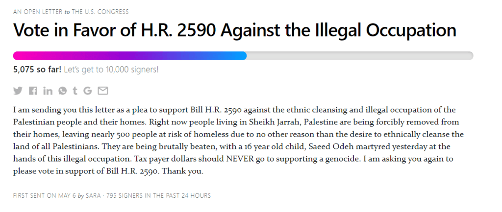 Visit- https://secure.everyaction.com/1bUDFJrq_kWz5sjKEeyoPQ2 for a fast and easy way to send letters to all your local and state representatives to end aid to Israeli Apartheid and Israeli occupation of Palestine.